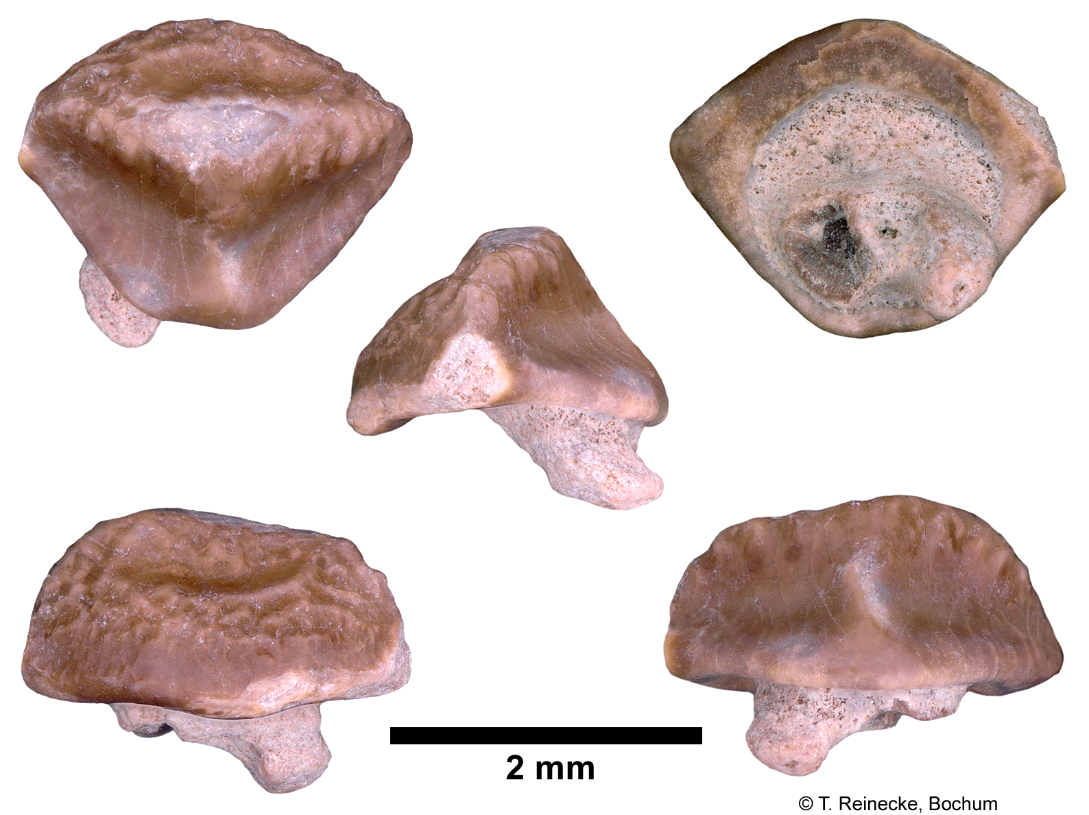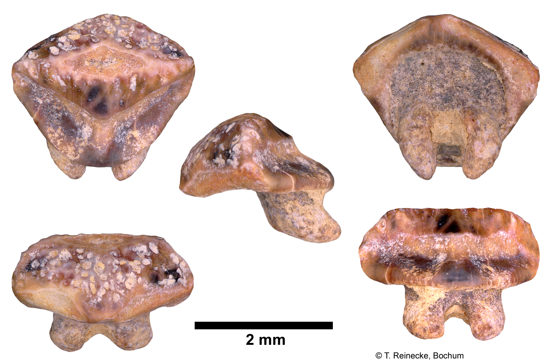 Dasyatis delfortriei Cappetta, 1970; low-crowned morph; Aquitanian, early Miocene; La Paillade, Montpellier, France; coll. Laboratoire de Paléontologie, Université Montpellier II, Institut des Sciences de l’Evolution de Montpellier (ISEM), ######, © T. Reinecke, Bochum