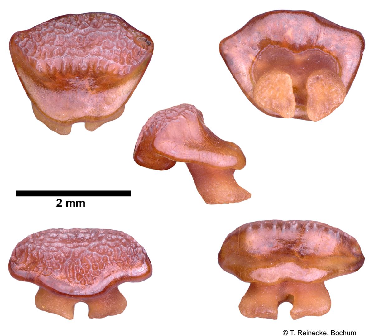In Fig. 7 ist ein Zahn von der Unterseite dargestellt; man sieht den kräftigeren Bau desselben gegenüber von Fig. 2; die Wurzelhörnchen convergiren nach innen.