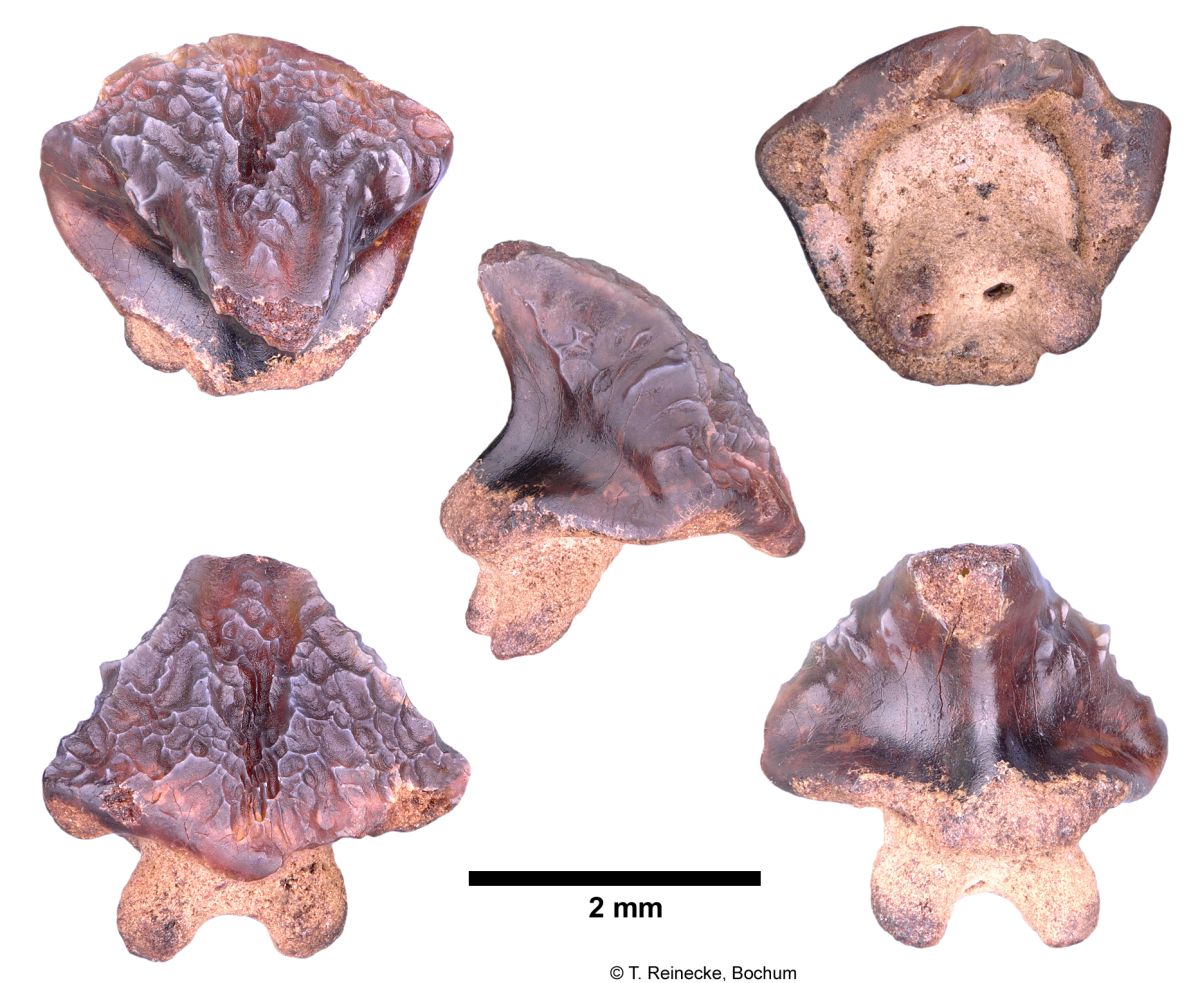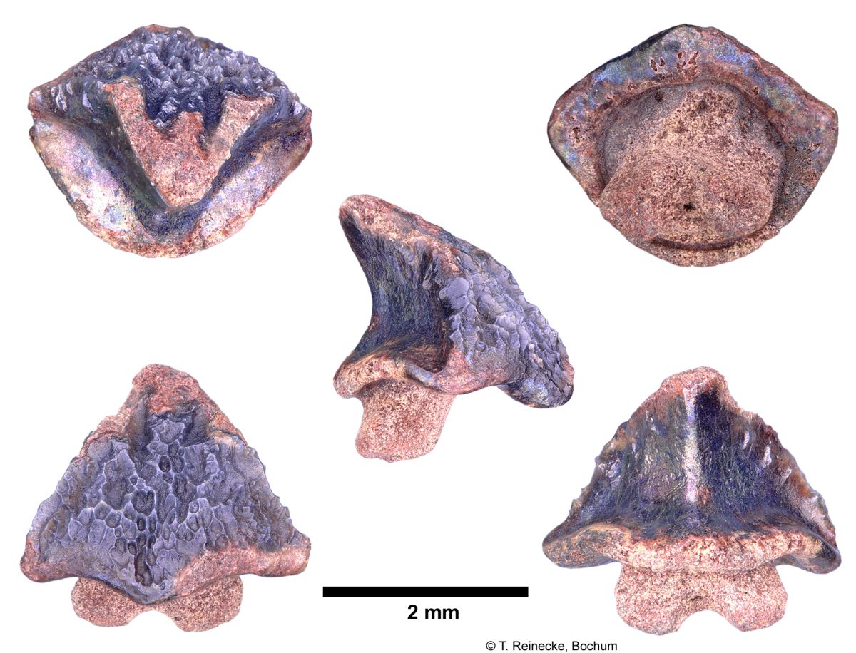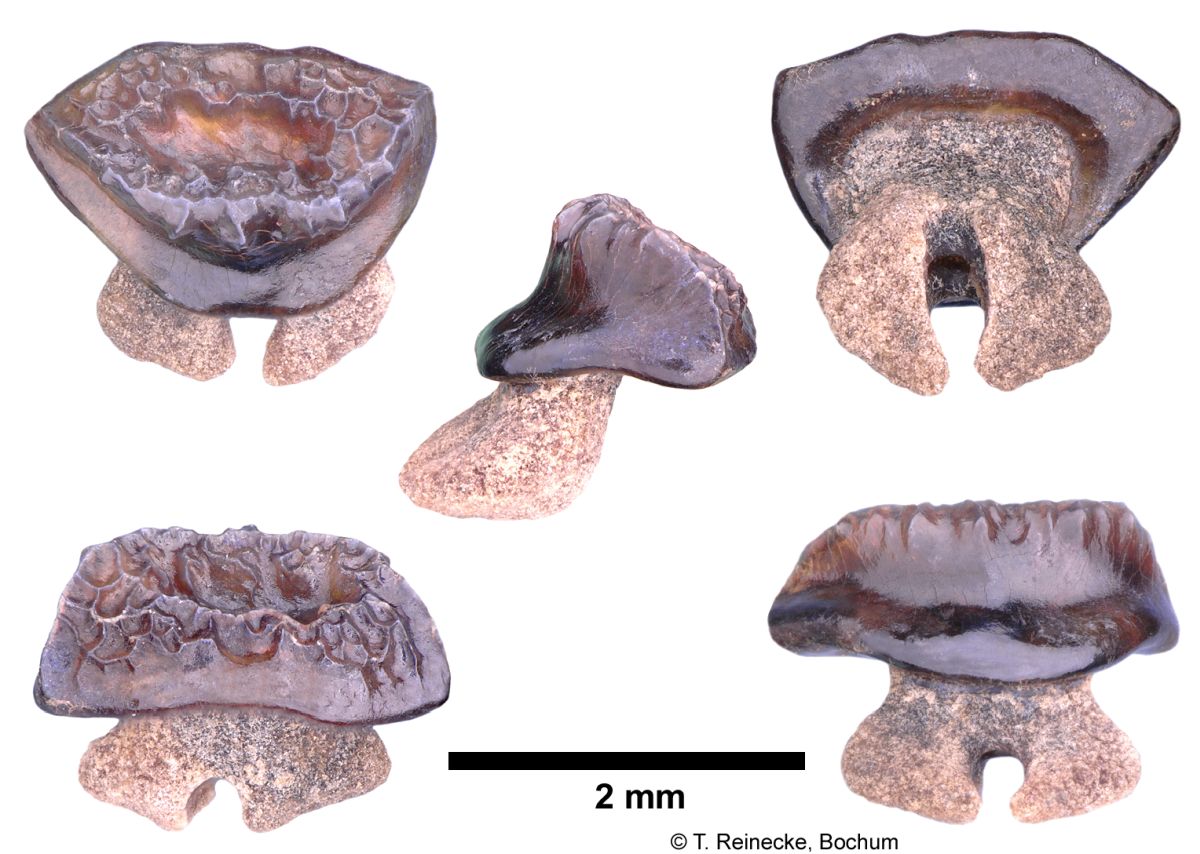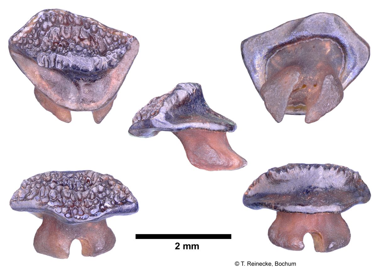 Dasyatis rugosa (Probst, 1877), low-crowned morph; Kalkofen Formation, Upper Marine Molasse, middle Burdigalian, early Miocene; abandoned sandpit "Steidle GmbH & Co" at Walbertsweiler, Baden-Württemberg, Germany; coll. E. Unger, Aulendorf, CU-W1-71 © T. Reinecke, Bochum