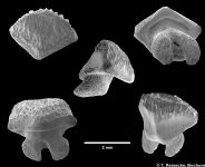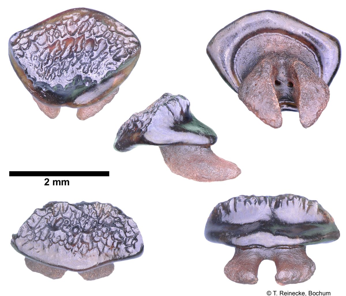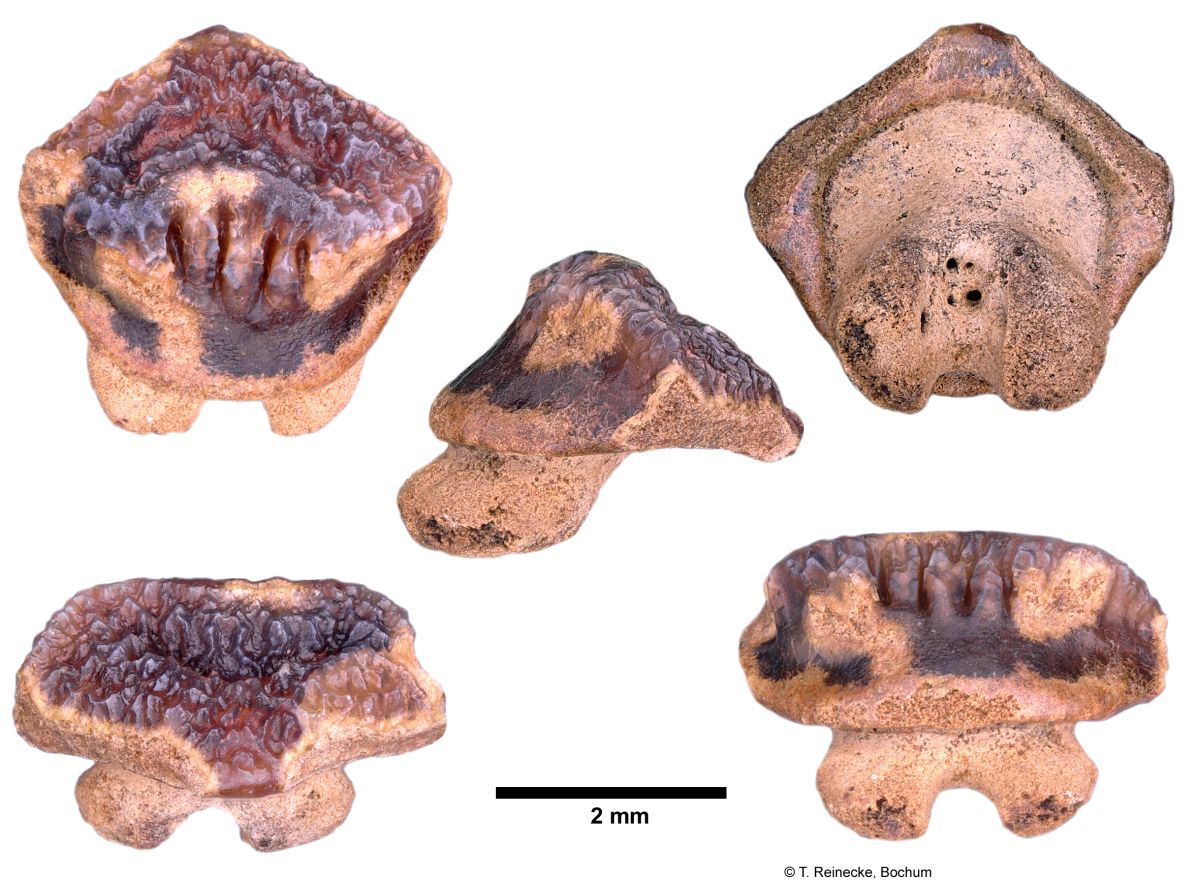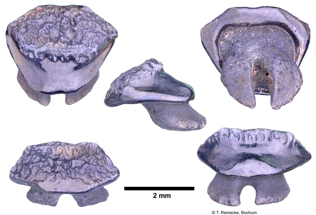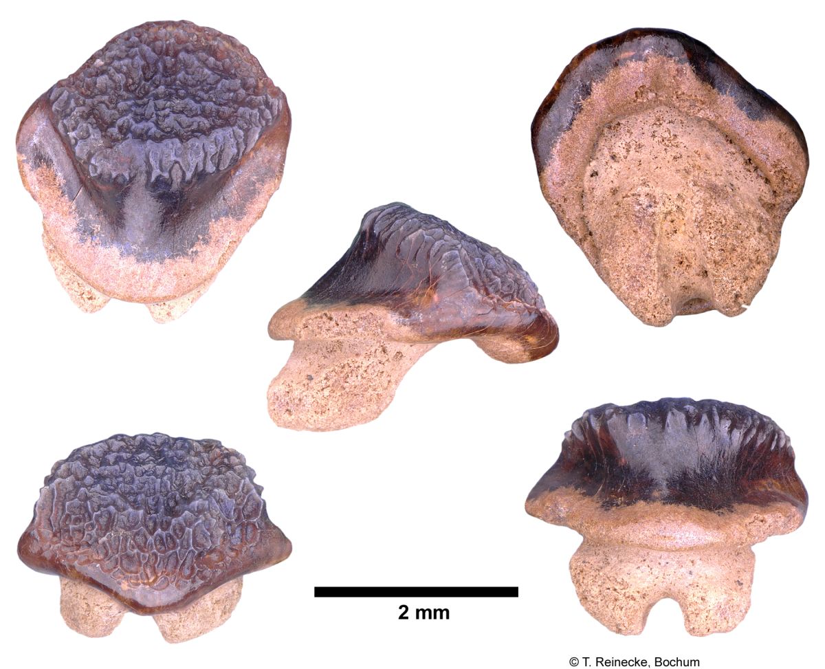 Dasyatis rugosa (Probst, 1877), low-crowned morph; Kalkofen Formation, Upper Marine Molasse, middle Burdigalian, early Miocene; abandoned sandpit "Steidle GmbH & Co" at Walbertsweiler, Baden-Württemberg, Germany; coll. E. Unger, Aulendorf, CU-W1-71 © T. Reinecke, Bochum