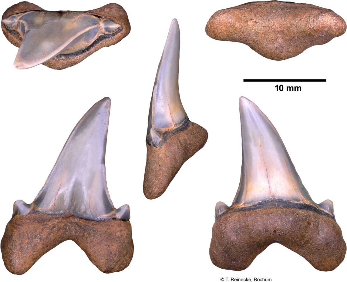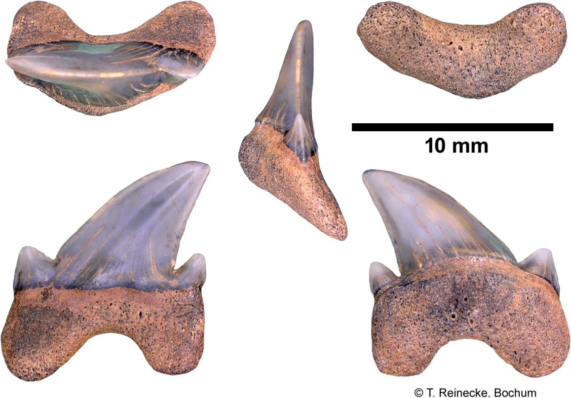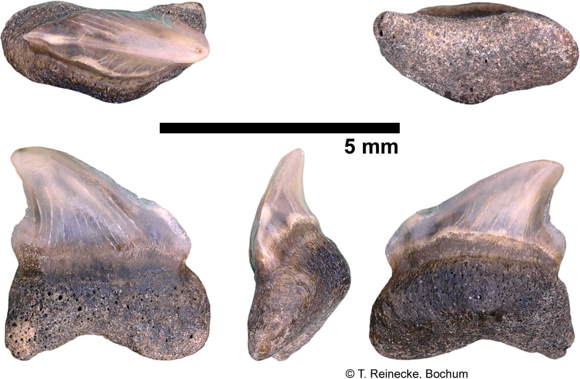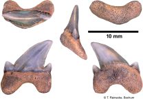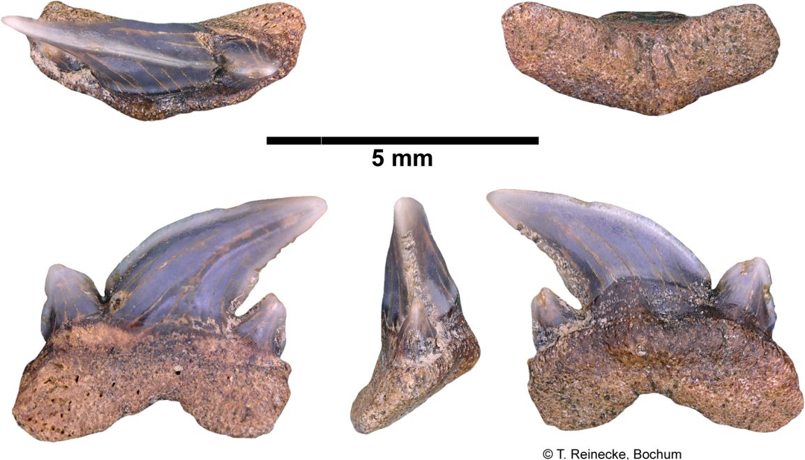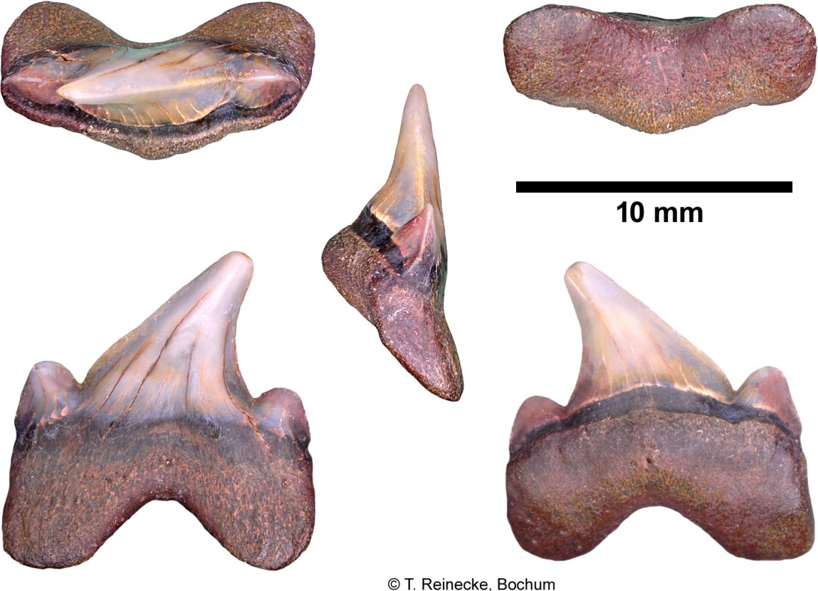 Original diasgnosis after Menner (1928) [1639] (translated from Russian): The crown of the anterior teeth has an almost straight main cusp, flat on the outer side and moderately convex on the inner side. On the 11 lateral teeth, the main cusp of the crown is slightly bent backwards and its outer surface is slightly swollen. The lateral cutting ridges on the teeth of this species are moderately developed and completely smooth. The lateral accessory cusplets, in the first pair, are separated from the main cusp by small notches that do not reach the base of the crown. Their apex has a slightly rounded outline. The enamel across the entire crown of the tooth is completely smooth. The root of the teeth under consideration is well-developed, thick with slightly developed wing-like processes, flattened at the ends.