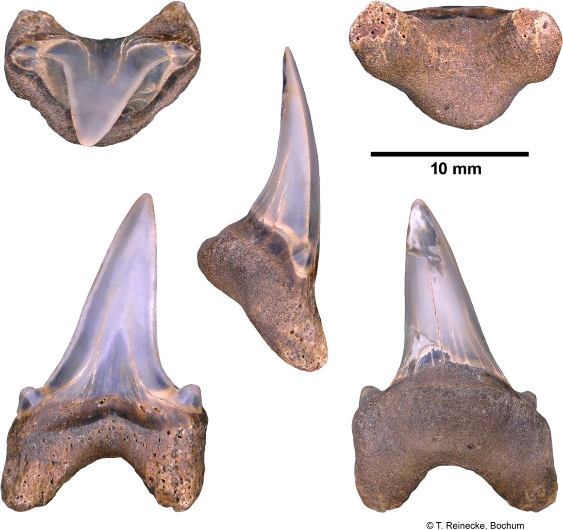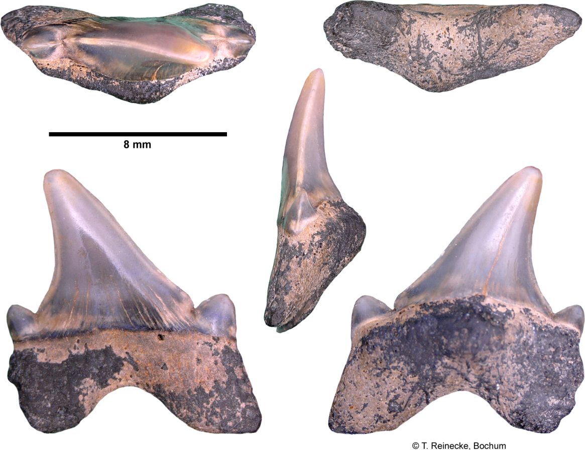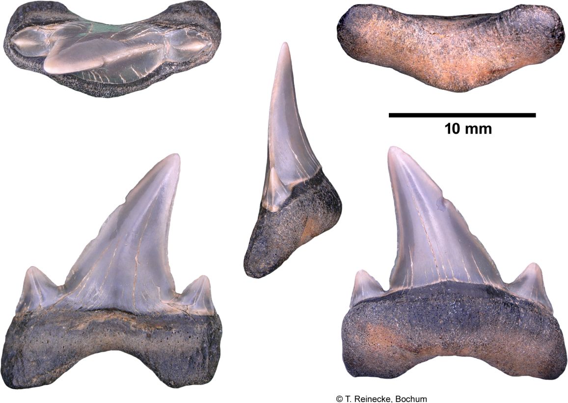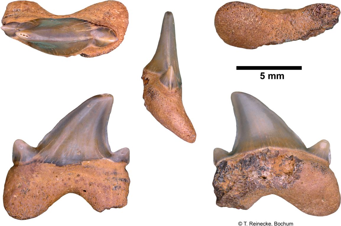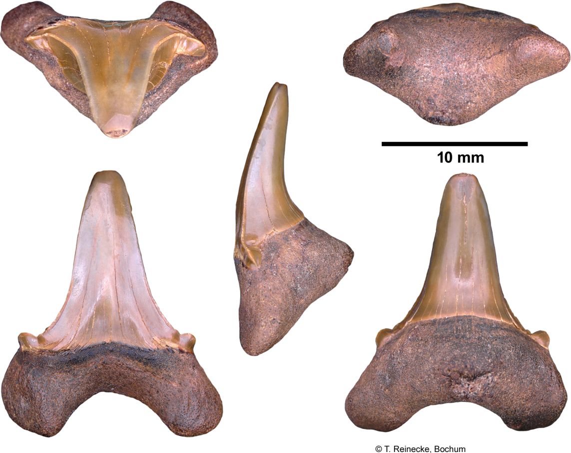 Original diasgnosis after Menner (1928) [1639] (translated from Russian): The crown of the anterior teeth has an almost straight main cusp, flat on the outer side and moderately convex on the inner side. On the 11 lateral teeth, the main cusp of the crown is slightly bent backwards and its outer surface is slightly swollen. The lateral cutting ridges on the teeth of this species are moderately developed and completely smooth. The lateral accessory cusplets, in the first pair, are separated from the main cusp by small notches that do not reach the base of the crown. Their apex has a slightly rounded outline. The enamel across the entire crown of the tooth is completely smooth. The root of the teeth under consideration is well-developed, thick with slightly developed wing-like processes, flattened at the ends.
