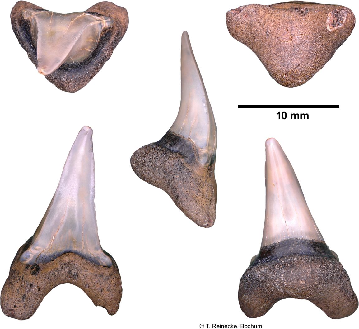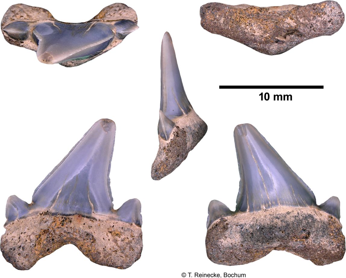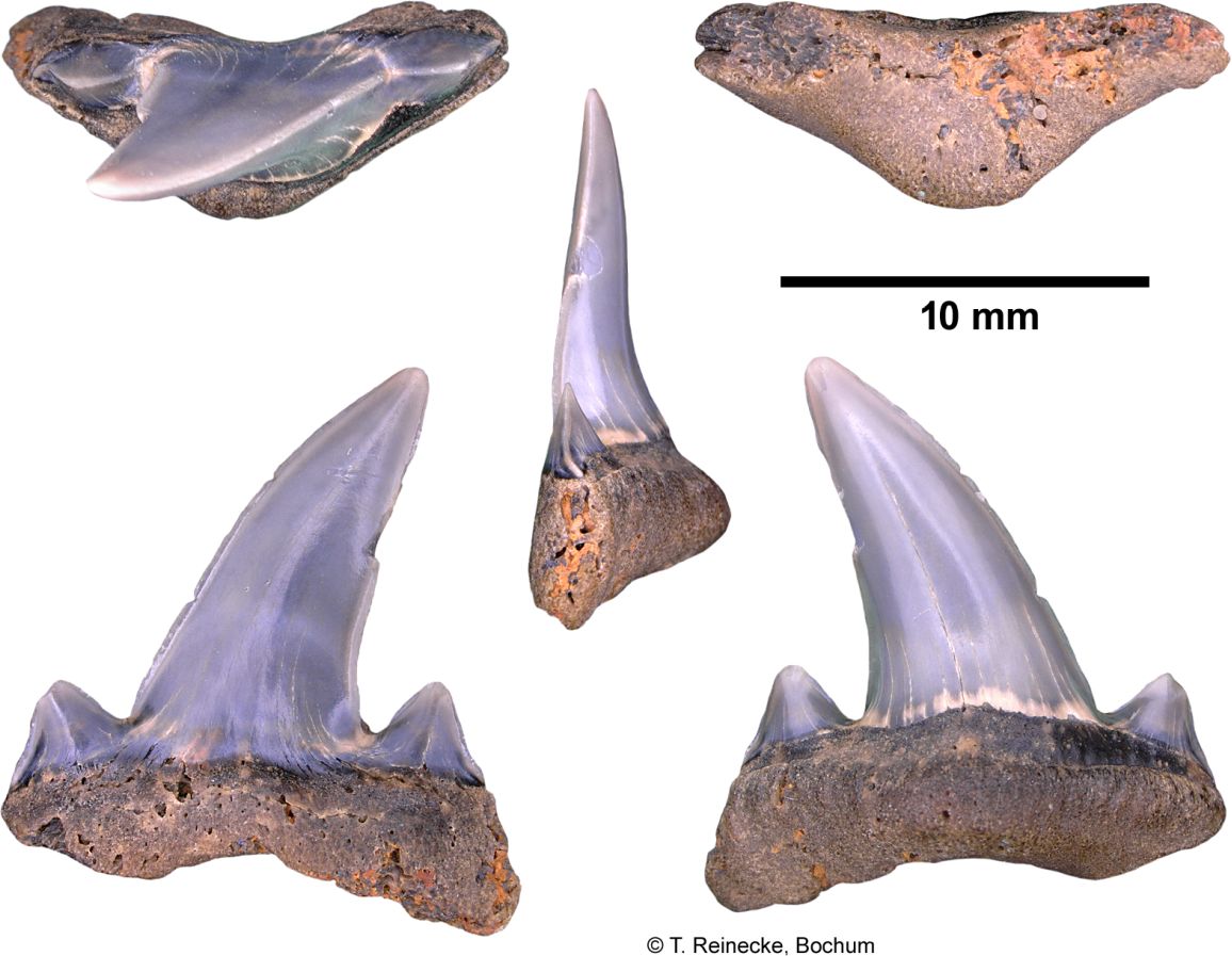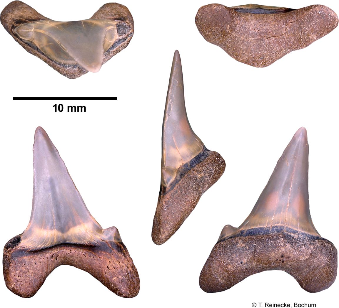 Original diasgnosis after Menner (1928) [1639] (translated from Russian): The crown of the anterior teeth has an almost straight main cusp, flat on the outer side and moderately convex on the inner side. On the 11 lateral teeth, the main cusp of the crown is slightly bent backwards and its outer surface is slightly swollen. The lateral cutting ridges on the teeth of this species are moderately developed and completely smooth. The lateral accessory cusplets, in the first pair, are separated from the main cusp by small notches that do not reach the base of the crown. Their apex has a slightly rounded outline. The enamel across the entire crown of the tooth is completely smooth. The root of the teeth under consideration is well-developed, thick with slightly developed wing-like processes, flattened at the ends.