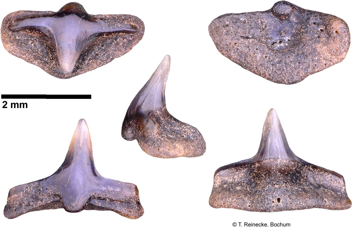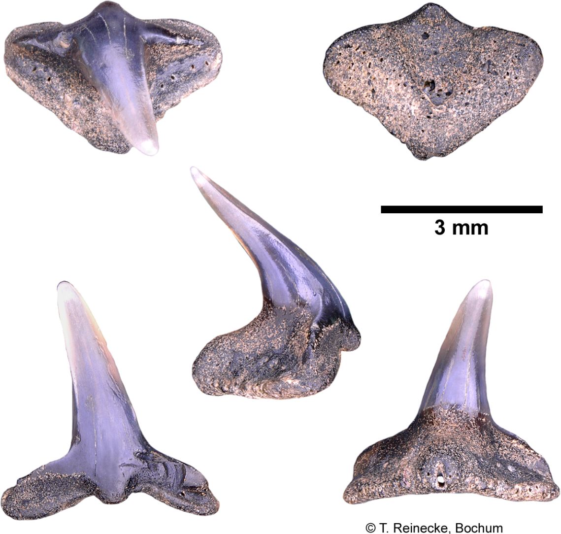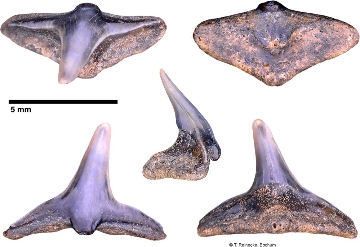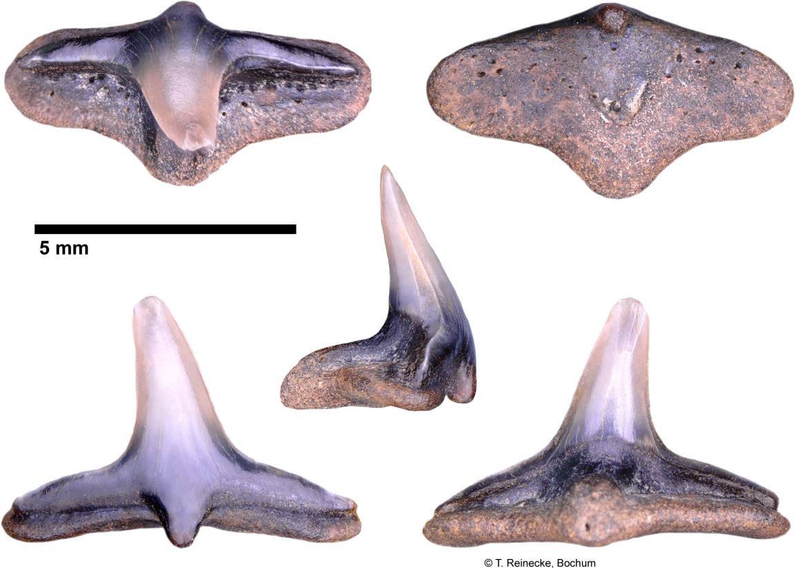 Original diagnosis after Winkler (1874) p. 13-14 [2575]: Les dents les plus curieuses de toute la collection remarquable que j'ai eue à ma disposition, sont certainement celles que l'on voit figurées agrandies environ trois fois dans les figures 18, 19, 20 et 21. J'ai cherché inutilement dans les auteurs qui traitent d'odontologie ; j'ai parcouru en vain tous les dessins de dents disséminés clans les ouvrages palichtliyologiques, nulle description, nulle figure ne m'a appris à quelle espèce, à quel genre, à quelle famille ont pu appartenir ces dents remarquables. Pour donner une idée de leur forme extraordinaire, disons que la couronne est un cône très élancé, pointu, un peu courbé. Cette couronne repose sur une racine large d'une apparence tout, à fait insolite; c'est une espèce de monticule; une pyramide à trois faces, dont la base forme un triangle à angles arrondis. Au milieu de la face inférieure de la racine (fig. 21) s'observe une dépression circulaire, et l'émail de la dent forme une espèce de lambeau terminé par un petit tubercule à la face interne de la racine. La fig. 18 nous montre une de ces dents vue par la face interne, la fig. 19 par la face externe, et la fig. 20 une dent vue de côté.