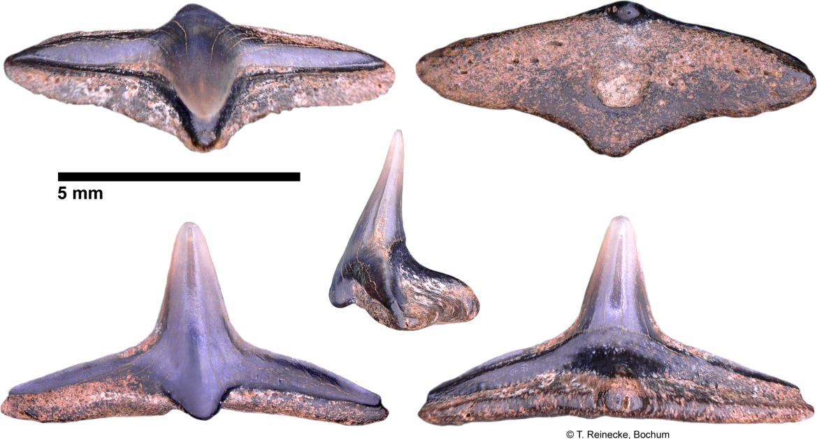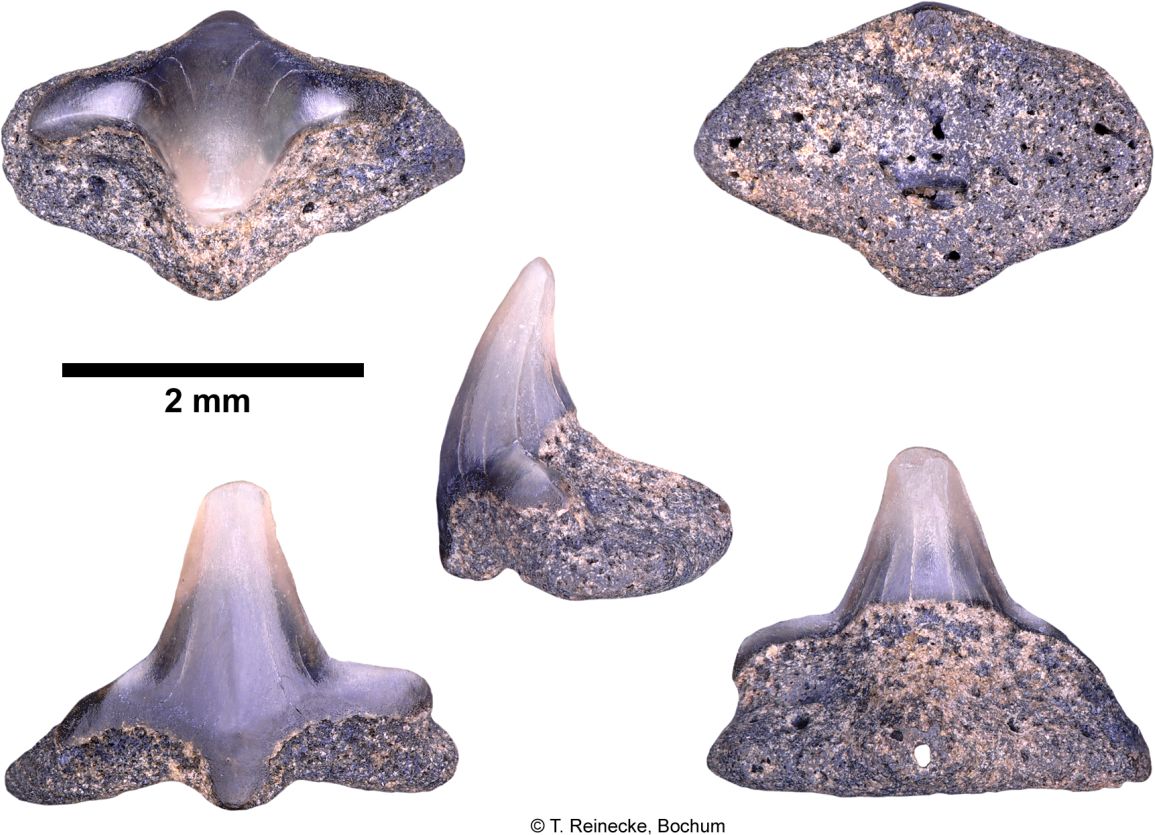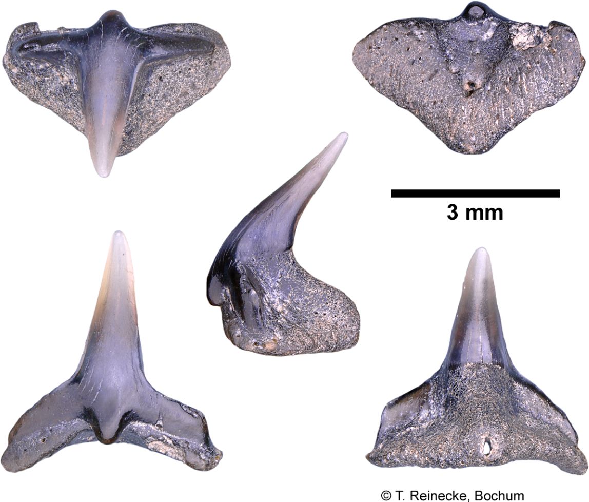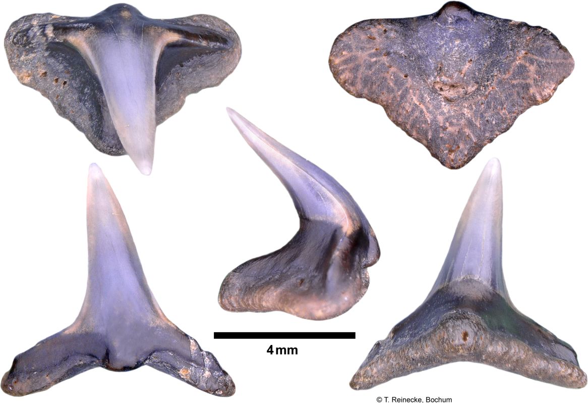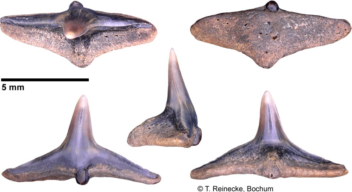 Original diagnosis after Winkler (1874) p. 13-14 [2575]: Les dents les plus curieuses de toute la collection remarquable que j'ai eue à ma disposition, sont certainement celles que l'on voit figurées agrandies environ trois fois dans les figures 18, 19, 20 et 21. J'ai cherché inutilement dans les auteurs qui traitent d'odontologie ; j'ai parcouru en vain tous les dessins de dents disséminés clans les ouvrages palichtliyologiques, nulle description, nulle figure ne m'a appris à quelle espèce, à quel genre, à quelle famille ont pu appartenir ces dents remarquables. Pour donner une idée de leur forme extraordinaire, disons que la couronne est un cône très élancé, pointu, un peu courbé. Cette couronne repose sur une racine large d'une apparence tout, à fait insolite; c'est une espèce de monticule; une pyramide à trois faces, dont la base forme un triangle à angles arrondis. Au milieu de la face inférieure de la racine (fig. 21) s'observe une dépression circulaire, et l'émail de la dent forme une espèce de lambeau terminé par un petit tubercule à la face interne de la racine. La fig. 18 nous montre une de ces dents vue par la face interne, la fig. 19 par la face externe, et la fig. 20 une dent vue de côté.