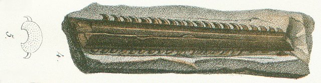 Outre les caractères génériques qui le distinguent des épines de Trygon et de Mjliobates, ce rayon se fait remarquer par sa forme conique, c. à. d. par la manière dont il s'amincit régulièrement vers sa pointe, tandis que les Pastenagues et les Mourines ont généralement leurs côtés parallèles et se terminent plus ou moins carrément. Ne connaissant cependant que l'original de la fig. 4, j'ignore si cet amincissement est progressif jusqu’à l'extrémité du rayon. La coupe fig. 5 montre que cet os a la forme d'un ovale très-régulier, sauf le sillon de sa face inférieure dont le pourtour est à-peu-près parallèle á la face supérieure. Les dents latérales sont très-acérées, très-rapprochées les unes des autres et fortement arquées en avant, c. à. d. du côté de la base du rayon.