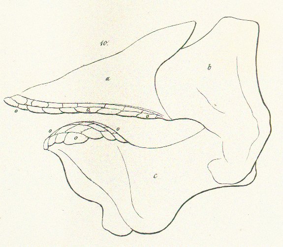 La forme des mâchoires est assez particulière en ce que leurs branches s'allongent considérablement en avant, ce qui constitue une différence très-marquée entre le genre Cestracion et certaines Raies qui ont aussi des dents en pavés, comme par exemple le Rhina Ancylodon Gray, dont les fig. 3 et 4, tab. H. représentent les mâchoires. Dans le genre Cestracion, les deux branches des mâchoires ne se confondent pas non plus complètement comme dans le genre Rhina, bien qu'il y ait une rangée impaire de dents sur leur symphyse, fig. 13, D; on distingue toujours les séries verticales que forment les dents du même degré, placées les unes derrière les autres, tandis que chez les Rhina ce sont les séries obliques qui prévalent. Les dents de la partie antérieure des mâchoires sont aussi beaucoup plus petites, dans le genre Cestracion, que celles des côtés; mais chez les Rhina, celles de la mâchoire supérieure sont seules plus petites, et celles de la mâchoire inférieure sont de beaucoup les plus grandes, puis il y a encore á la mâchoire supérieure et á la mâchoire inférieure deux grands bourrelets de grandes dents, correspondant á des échancrures de la mâchoire opposée où les dents sont plus petites; les dents antérieures de Cestracion sont en outre plus pointues, c'est-à-dire, que la partie moyenne de la couronne s’élève en forme de pointe mousse plus ou moins saillante, tandis que celles des côtés des mâchoires sont simplement bombées et portent une simple côte plate sur le milieu de leur longueur; les dernières dents sont même toutes plates; celles de Rhina sont également obtuses. Les rangées que forment ces dents ne sont pas exactement verticales; convergeant vers l'intérieur de la gueule, comme dans les Squales ordinaires, elles sont au contraire obliques et même arquées en arrière, d'où il résulte des séries hélicoïdes, formant quatre grands bourrelets fusiformes, fig. 11. o.o. et o'o', qui agissent les uns sur les autres comme des rouleaux á pression. On voit surtout bien cette disposition générale des dents dans la fig. 13, qui représente la mâchoire inférieure vue d'en haut, et mieux encore dans la fig. 11, où les deux mâchoires sont représentées dans leurs l'apports naturels, vues par derrière. Dans la fig. 12, les rangées de dents se voient en profil, et l'on remarque comment les dents se succèdent de dehors en dedans. Quant á la structure des dents, elle est semblable à celle des dents de Myliobates, c'est-à-dire, que la racine est osseuse et poreuse, comme le fait voir la coupe longitudinale, fig. 14, et la coupe transversale, fig. 15, d'une grande dent du côté de la mâchoire; cette racine est séparée de la couronne par un étranglement plus ou moins marqué, que l'on remarque également dans ces deux figures. La couronne elle-même paraît composée de fibres verticales ou de petits tubes, plus fins et plus denses vers la surface, où ils forment comme une couche d'émail, représentée par la zone blanche du bord des fig. 14 et 15. Les fig. 17 et 18 représentent deux dents antérieures grossies, l'une, fig. 17, prise en c. de la fig. 13, l'autre, fig. 18, en o". La première se rapproche davantage par sa forme des dents de Squales, cependant sa base rugueuse la ferait toujours reconnaître pour une dent de Cestracionte, même lorsqu'on la trouverait isolée; la seconde passe déjà plus complètement á la forme ordinaire des dents de Cestracionte: placée sur le côté antérieur de la mâchoire, la partie saillante qui formait une pointe dans les dents plus avancées, n'est plus qu'une arête proéminente entourée de rugosités et de plis divergeant vers le pourtour de la couronne. Les grandes dents o. sont plus plates encore; au lieu arête saillante, il n'y a plus á leur surface qu'une faible côte longitudinale plate et un peu plus lisse que le reste de la surface de la couronne, qui est complètement rugueux et présente une sorte de réseau de rides et d'aspérités inégales. Enfin les dents postérieures o' sont entièrement plates, c'est á peine si l'on y retrouve quelques traces d'une côte médiane; en revanche les rugosités de leur surface sont plus grossières. La disposition de ces dents est telle, que malgré l'inégalité de leur forme elles recouvrent complètement la surface supérieure et intérieure des mâchoires, en s'engageant les unes dans les autres, par leurs bords.