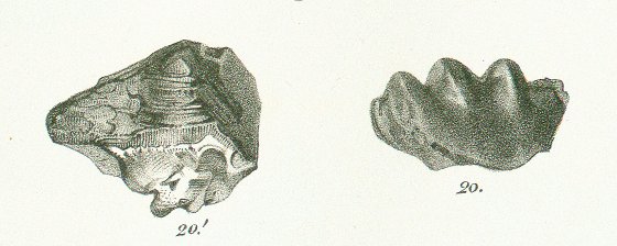 Il est facile de distinguer cette espèce de dents des précédentes. Sa surface est plane et parfaitement lisse; ses dents obtuses ne sont point saillantes au-dessus de la surface de la couronne; elles sont simplement séparées par des dépressions qui se confondent avec les échancrures du bord extérieur. La corne antérieure est plus petite que les trois suivantes, qui sont légèrement inclinées en avant; la dernière qui n'est pas plus grande que les cornes latérales est elle-même transversale. Le bord interne est irrégulier. Bien que la surface de cette dent soit généralement plane, son bord postérieur est cependant beaucoup plus haut que le bord antérieur, qui s'abaisse insensiblement comme le montre la fig. 20.