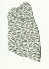 Ces dents que, dans l'origine, j'osais á peine séparer génériquement des Psammodus et des Cochliodus, ont une structure microscopique si semblable á celle des Cestracions et des Ptychodus, que, par cela mème, la coupe générique que j'ai proposée parait entièrement justifiée. On retrouve en effet dans les dents de Strophodus la même disposition parallèle des canaux médullaires que l'on voit dans les Psammodontes, et une couche d'émail á la surface, semblable á celle des Cestracions; elles ne se distinguent de celles du genre Acrodus, qui s'en rapprochent par leur forme et par la présence d'une couche émaillée, qu'en ce que leurs canaux médullaires sont parallèles, tandis qu'ils sont réticulés dans la couronne des Acrodes. Mais si la disposition des canaux médullaires de la racine et de la couronne des Strophodus est la même que dans les genres décrits ci-dessus, il n'en existe pas moins des différences notables entre eux; et d'abord, les canaux médullaires verticaux sont encore plus fins et plus effilés que dans les Ptychodus, et, au lieu de finir d'une manière abrupte près de la surface de la dentine, en donnant naissance á une panache de tubes calcifères, ils se terminent insensiblement en un tronc effilé qui disparaît dans des ramifications dendritiques de tubes calcifères, ce qui donne aux canaux médullaires une forme très-élégante. Ces ramifications dendritiques forment, á la surface de la dentine, une espèce de feutre semblable à celui des Cestracions. La couche émaillée, qui n'est que très-indistinctement séparée de la dentine proprement dite, montre, comme celle-ci, des tubes calcifères très-fins et feutrés à sa surface. Pour montrer qu'il existe aussi des différences spécifiques, nous avons figuré l'une á côté de l'autre, des coupes de deux espèces distinctes, du Stroph. reticulatus et du Stroph. tenuis. Les tubes calcifères de ce dernier sont moins feutrés, et les canaux médullaires plus gros que ceux de l'autre espèce. Les fig. 3 et 4 montrent une coupe verticale, et une coupe horizontale du Stroph. tennis; fig. 5 est une coupe verticale du Stroph. reticulatus.