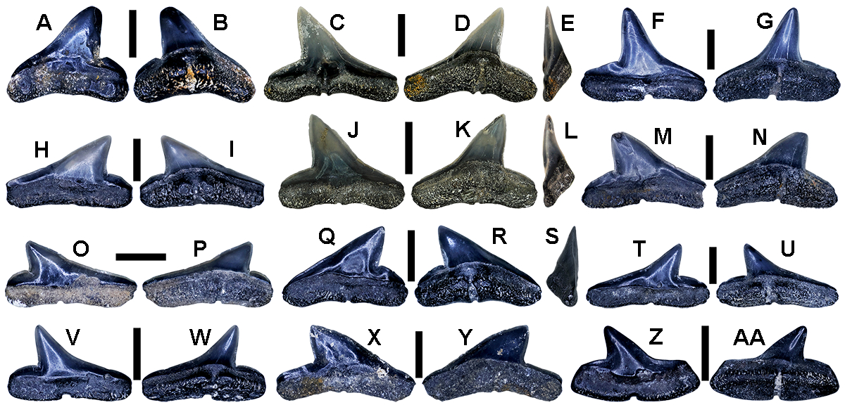 Sphyrna robustum Cicimurri, Ebersole, Stringer, Starnes & Phillips, 2025; “Sphyrna” robustum sp. nov., teeth. A–B. SC2013.28.166, upper right anterior tooth. A. Labial view. B. Lingual view. C–E. SC2013.28.167 (paratype), lower right lateral tooth. C. Labial view. D. Lingual view. E. Mesial view. F–G. SC2013.28.170, lower right anterior tooth. F. Labial view. G. Lingual view. H–I. SC2013.28.181, upper right lateral tooth. H. Labial view. I. Lingual view. J–L. SC2013.28.169, lower right antero-lateral tooth (paratype). J. Labial view. K. Lingual view. L. Mesial view. M–N. SC2013.28.172, upper left lateral tooth. M. Labial view. N. Lingual view. O–P. SC2013.28.180, upper left postero-lateral tooth. O. Labial view. P. Lingual view. Q–S. SC2013.28.171 (holotype), upper right lateral tooth. Q. Labial view. R. Lingual view. S. Mesial view. T–U. SC2013.28.182, lower left lateral tooth. T. Labial view. U. Lingual view. V–W. SC2013.28.915, lower right lateral tooth. V. Labial view. W. Lingual view. X–Y. SC2013.28.916, upper left lateral tooth. X. Labial view. Y. Lingual view. Z–AA. SC2013.28.917, lower right posterolateral tooth. Z. Labial view. AA. Lingual view. Scale bars = 3 mm.