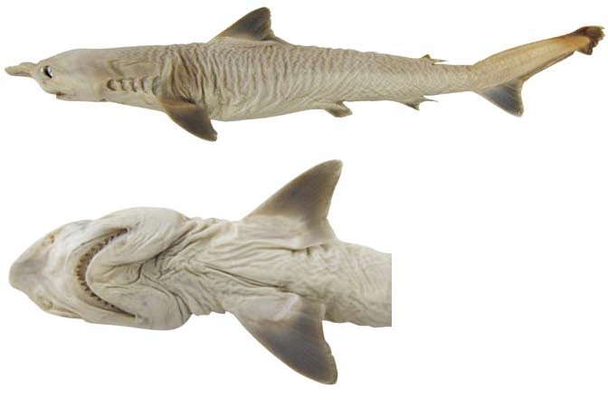 Lateral view and ventral view of head of a fresh adult specimen of Carcharhinus borneensis IPPS BO428 (adult male 574 mm TL). In: White, W.T. & Last, P.R. & LIM, A.P.K. (2010): Rediscovery of the rare and endangered Borneo Shark Carcharhinus borneensis (Bleeker, 1858) (Carcharhiniformes: Carcharhinidae). CSIRO Marine and Atmospheric Research Paper, 32: 17-28