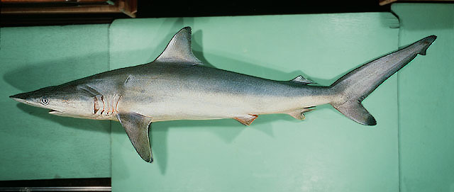 A slender shark with a long, narrow, pointed snout, long gill slits and small, narrow-cusped teeth; first dorsal fin small; no interdorsal ridge; labial furrows longer than in any other grey shark [536]. Grey above, white below, with a conspicuous white band on sides; second dorsal, anal, undersides of pectorals and lower caudal-fin lobe black or dark grey-tipped in subadults and adults, but unmarked or nearly so in small individuals [544].