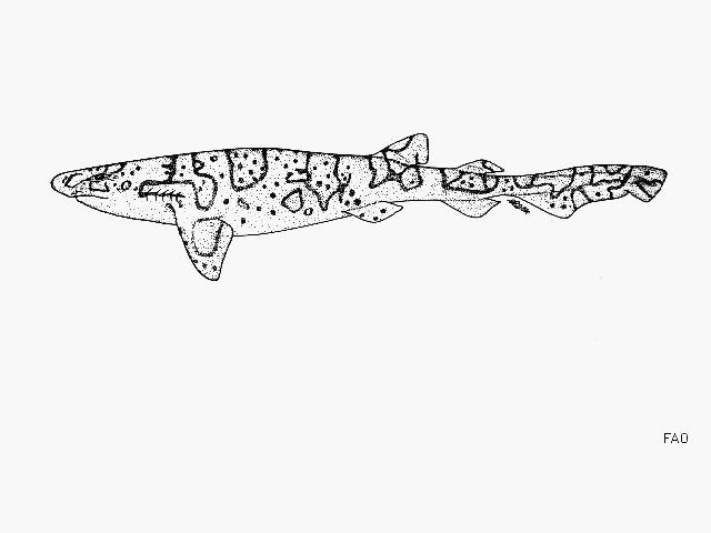 Original diagnosis after Compagno, 1984 [517]: Field Marks: A catshark with a stout body, no labial furrows, and with a striking colour pattern of narrow dark lines arranged as open-centred saddles, loops, reticulations and spots, as well as moderately large dark spots (absent in young) on light ground colour, anterior nasal flaps elongate, lobate, and not overlapping mouth posteriorly, and second dorsal fin much smaller than first. Diagnostic Features: Snout rounded-angular in dorsoventral view, very short; anterior nasal flaps narrowly lobate, not overlapping mouth posteriorly. Colour pattern of dark brown lines formed into open-centred saddles, spots, and reticulations on a light greyish brown background, also some small dark brown spots on sides and back; underside of head and abdomen spotted; fins without conspicuous light margins. A small species, adult at less than 50 cm.