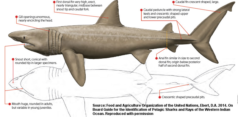 Cetorhinus maximus (Gunnerus, 1765), © FAO, Food and Agriculture Organization of the United Nations, Ebert, D.A. 2014. On Board Guide for the Identification of Pelagic Sharks and Rays of the Western Indian Ocean. Reproduced with permission, illustration by Marc Dando , Wildlife Illustrator