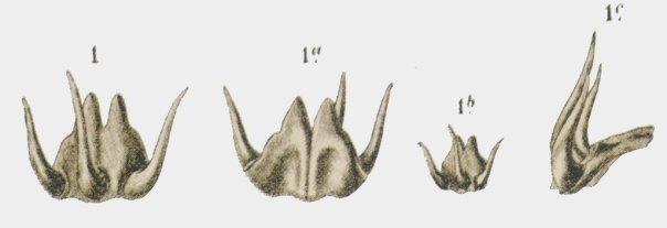 Original description LAWLEY, 1876, p.87 [1396]: Come si vede nella fig., 1", la radice ha due rami, è quasi saldata per tutta la sua lunghezza, ma sul davanti, giust'appunto nella sua saldatura, sorge il dente centrale come nella fig. 1, e forma con i due laterali tutto un dente; il loro apice cambia di colore atteso essere tutto dentrina ed è trasparente; i denti sono flessuosi, fig. lc, e la radice fa quasi angolo retto con essi. Di questi denti ne possedo due perfettamente completi, e sette più o meno mutilati, ma tutti egualmente conformati, e riconoscibili: mi provengono tutti da Orciano, dove sembrano rarissimi. Per quanto io abbia osservato, non mi è stato possibile di vedere un dente simile ne' viventi, nè rappresentato in disegno nè di pesci nè di rettili.