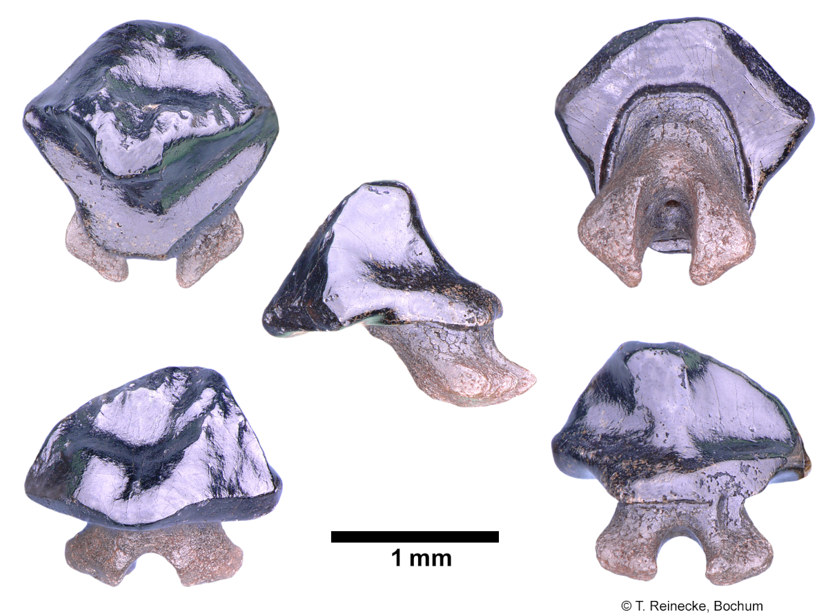 Ces dents sont caractérisées par leur petite taille et une carène transverse très haute et tranchante; le dimorphisme sexuel semble peu marqué.