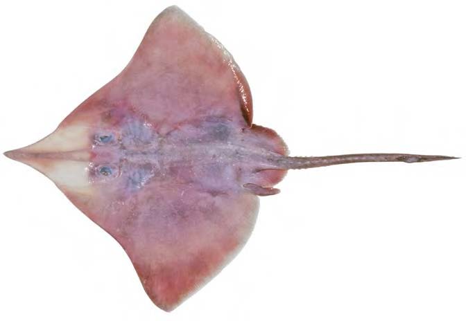 Original Diagnosis of LAST, WHITE & POGONOSKI, 2008 [3309]: A medium-sized species of Dipturus (to 72 cm TL) with the following combination of characters: disc relatively broad with narrowly rounded to angular apices, width 64–68% TL, 1.1–1.2 times its length; snout angle 64–74°; tail length 0.8 in distance from snout tip to rear of cloaca; tail slender, somewhat rounded in crosssection, width 1.5–1.8 times height at its midlength, 1.5– 1.8 times at first dorsal-fin origin; pre-upper jaw length 19–22% TL, 2.3–2.7 times internasal width; ventral head length 33–35% TL; snout length 3.9–4.6 times interorbital width; orbit diameter 53–85% interorbital width; first dorsal-fin height 1.6–2.4 in its base length; distance from first dorsal-fin origin to tail tip 2.8–3.2 times first dorsal-fin base length, 2.2–3.2 times caudalfin length; pelvic fins of medium size, length of posterior lobe of adult males 17–18% TL, length of anterior lobe 69–74% of posterior lobe; adult clasper elongate, 27– 28% TL, connected to pelvic-fin inner margin at about 32–33% of its length from cloaca; anterior margins of both surfaces of disc of adult males with bands of granular denticles, dorsal bands absent in juveniles and large females; nuchal thorns usually absent (single weak thorn occasionally present); malar thorn patch small; tail usually with a single thorn row in males, 1–2 additional pairs of variably developed lateral rows in females; total pectoral radials 74–79; trunk centra 26–30; predorsal centra 76–84; total centra about 121–128; tooth rows in upper jaw 34–40; uniformly pale yellowish brown dorsally; greyish centrally with a paler outer disc and tail ventrally; gill membranes whitish, strongly demarcated from adjacent ventral head; ventral sensory pores small, distinct, black-edged, sometimes surrounded by small dusky blotches.
