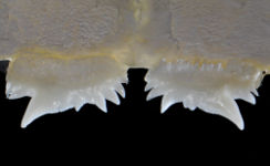 The bramble shark Echinorhinus brucus has thorn-like denticles on body which are very large (single denticles up to about 15mm in basal diameter in adults), sparse irregularly distributed and thorn-like with smooth basal margins, some bases fused into compound plates. Dorsal surface dark purplish-grey to brown with white denticles, ventral surface paler; sides and back may have dark spots. Tooth count 20-26/21-26.As with the other member of the family Echinorhinidae, it has a relatively short snout and stout body; two small spineless dorsal fins, close together, towards posterior part of body and originating behind pelvic fin origin. No anal fin and subterminal notch on caudal fin. Small spiracles, very short labial furrows and teeth on both jaws alike, with a central oblique bladelike cusps with up to 3 cusplets on each side (absent in juveniles) [518] [1388] [536].