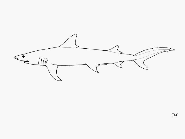 A slender weasel shark with a long, broadly rounded snout, large curved, saw-edged teeth in the upper jaw, and hooked lower teeth protruding from mouth; gill slits long; fins strongly curved [536]. Light grey or bronzy with no prominent markings [536].