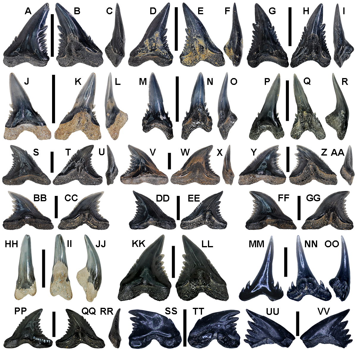 Hemipristis intermedia Cicimurri, Ebersole, Stringer, Starnes & Phillips, 2025; Fig. 6. Hemipristis intermedia sp. nov., teeth. A–C. MMNS VP-12035, lower left lateral tooth. A. Labial view. B. Lingual view. C. Mesial view. D–F. MMNS VP-12036 (paratype), lower left lateral tooth. D. Labial view. E. Lingual view. F. Mesial view. G–I. MMNS VP-12037 (paratype), upper left anterior tooth. G. Labial view. H. Lingual view. I. Mesial view. J–L. MMNS VP-12038, lower right anterolateral tooth. J. Labial view. K. Lingual view. L. Mesial view. M–O. MMNS VP-12039, lower right anterior tooth. M. Labial view. N. Lingual view. O. Mesial view. P–R. SC2013.28.80 (paratype), lower left anterior tooth. P. Labial view. Q. Lingual view. R. Mesial view. S–U. MMNS VP-12040, upper left lateral tooth. S. Labial view. T. Lingual view. U. Mesial view. V–X. MMNS VP-12042, upper left lateral tooth. V. Labial view. W. Lingual view. X. Mesial view. Y–AA. MMNS VP-12043, upper right lateral tooth. Y. Labial view. Z. Lingual view. AA. Mesial view. BB–CC. MMNS VP- 12044, upper left lateral tooth. BB. Labial view. CC. Lingual view. DD–EE. MMNS VP-12045, upper left lateral tooth. DD. Labial view. EE. Lingual view. FF–GG. MMNS VP-12046, upper left lateral tooth. FF. Labial view. GG. Lingual view. HH–JJ. MMNS VP-6625, lower left symphyseal tooth. HH. Labial view. II. Lingual view. JJ. Mesial view. KK–LL. SC2013.28.90, upper right lateral tooth. KK. Labial view. LL. Lingual view. MM–OO. MMNS VP-7604, juvenile lower left anterior tooth. MM. Labial view. NN. Lingual view. OO. Mesial view. PP–RR. SC2013.28.73 (holotype), upper right lateral tooth. PP. Labial view. QQ. Lingual view. RR. Mesial view. SS–TT. SC2013.28.103, juvenile upper left postero-lateral tooth. SS. Labial view. TT. Lingual view. UU–VV. SC2013.28.104, juvenile upper left lateral tooth. UU. Labial view. VV. Lingual view. Scale bars: A–U, HH–JJ = 1 cm; MM–OO = 2 mm; V–GG, KK–LL, PP–QQ = 5 mm; RR–UU = 1 mm. From Cicimurri et al. (2025)