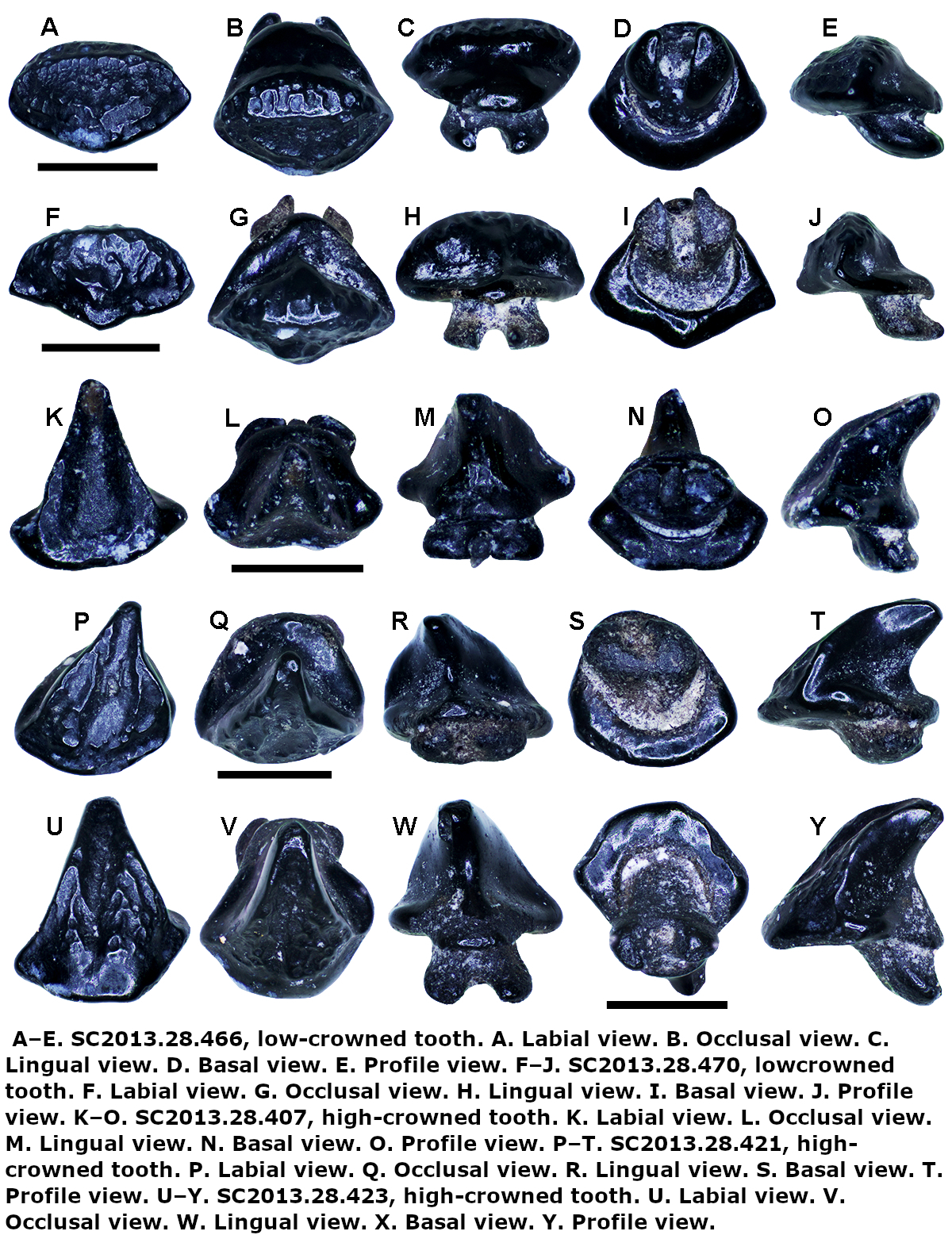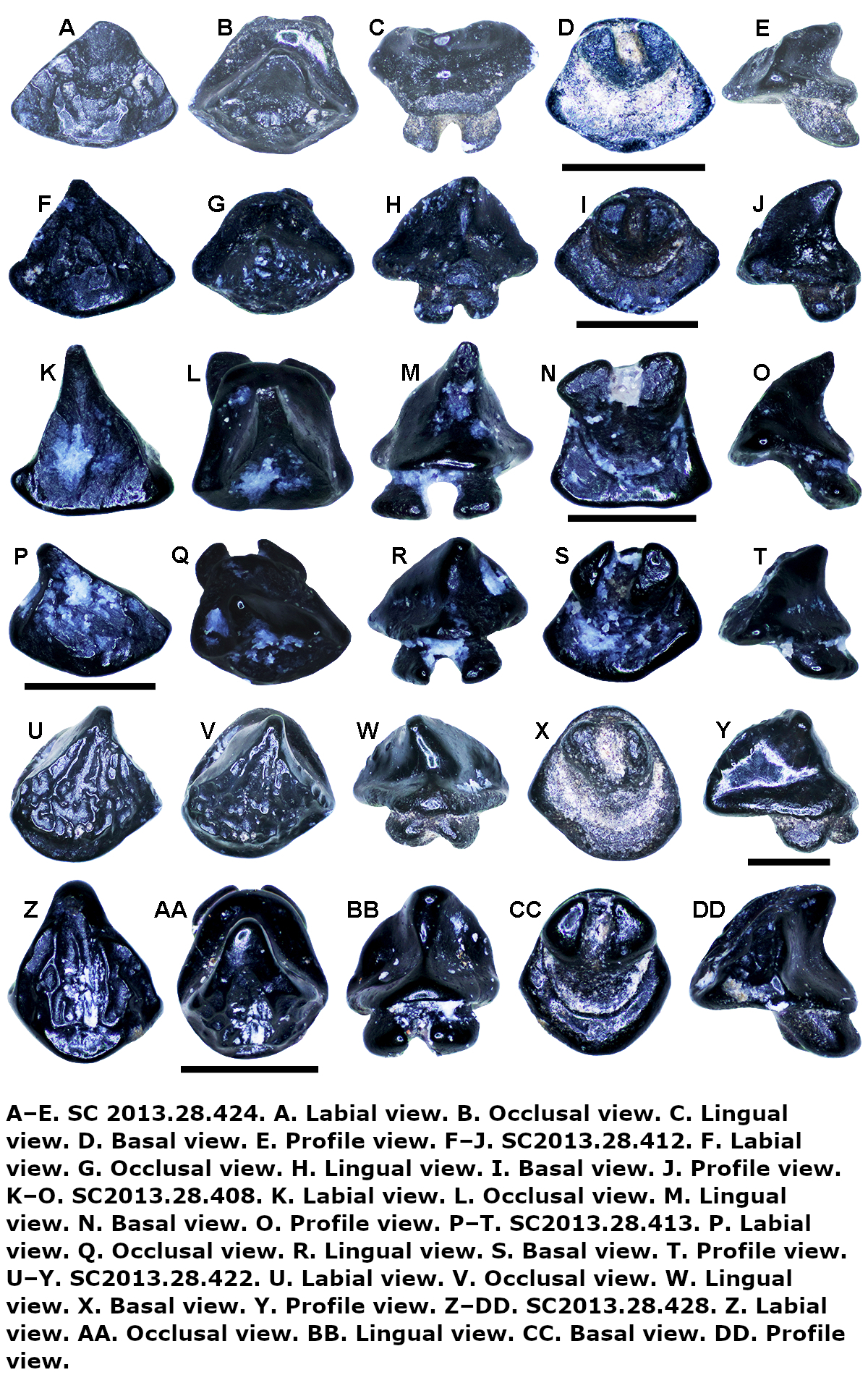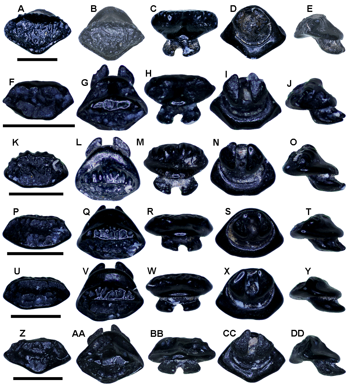 Hypanus heterodontus Cicimurri, Ebersole, Stringer, Starnes & Phillips, 2025; low-crowned teeth. A–E. SC2013.28.461. A. Labial view. B. Occlusal view. C. Lingual view. D. Basal view. E. Profile view. F–J. SC2013.28.437. F. Labial view. G. Occlusal view. H. Lingual view. I. Basal view. J. Profile view. K–O. SC2013.28.440. K. Labial view. L. Occlusal view. M. Lingual view. N. Basal view. O. Profile view. P–T. SC2013.28.445. P. Labial view. Q. Occlusal view. R. Lingual view. S. Basal view. T. Profile view. U–Y. SC2013.28.455. U. Labial view. V. Occlusal view. W. Lingual view. X. Basal view. Y. Profile view. Z–DD. SC2013.28.450. Z. Labial view. AA. Occlusal view. BB. Lingual view. CC. Basal view. DD. Profile view. Scale bars = 1 mm. From Cicimurri et al. (2025)
