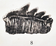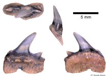 Original description after Agassiz (1843) [25]: Le caractère essentiel de ces dents réside dans le nombre considérable de fines dentelures qui règnent au bord antérieur du dentelon principal, et qui se font remarquer par leur grande uniformité, quoiqu'elles occupent la moitié de sa longueur. Je ne doute pas dès-lors quo ces dents n’appartiennent á une espèce particulière, différente de toutes celles que nous venons de décrire. Les dentelons sont au nombre de cinq dans les deux exemplaires que j'ai vus jusqu’à présent, ils vont en décroissant d'une manière régulière d'avant en arrière; les premiers sont un peu plus redressés dans le petit exemplaire (fig. 4), que dans le grand (fig. 5). Ils sont en outre plus obtus que dans la plupart des autres espèces. La racines est épaisse et légèrement arquée, ainsi que la base de l'émail.