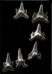 Monognathic heterodonty gradual well developed; anterior teeth abruptly greater than the parasymphysial ones and lateral teeth smaller distally, with smaller and thicker principal cusps (Fig. 15). Sexual heterodonty well pronounced with females presenting more cusplets in parasymphysial, anterior and lateral teeth (4) and principal cusp shorter in relation to males. Tooth counts 20–31 0–1 20–30/18–28 1 19–28 (22–25/19–22). Parasymphysial teeth with a principal cusp flanked by one or two cusplets on each side; proximal cusplets 2/3 the height of principal cusp and marginal cusplets poorly developed. Protuberances on the crown base or striae absent. Anterior teeth with the same number of cusplets and greater and distally narrow principal cusp in relation to parasymphysial teeth. Females with anterior upper teeth presenting proximal cusplets half the height of the principal cusp and marginal cusplets corresponding to 2/3 of proximal cusplets; marginal cusplets half the height of proximal cusplets on lower teeth. Males with upper and lower anterior teeth with a strong principal cusp and cusplets poorly developed or absent. Striae absent from anterior lower teeth and extending almost through the entire length of crown on upper teeth. Lateral teeth with similar shape and slightly smaller than the anterior teeth. Protuberances on the crown base and striae running from the base toward the apex of the crown in both jaws. Lateral upper teeth with slightly oblique principal cusp; straight principal cusp on lower teeth. Commissural upper teeth with three cusplets; principal cusp stronger, slightly oblique and in a more lateral position in the crown. Mesial proximal cusplet with similar length and width corresponding to 2/3 of the principal cusp. Mesial marginal and distal cusplets slightly smaller than the mesial proximal one. Commissural lower teeth with four cusplets; principal cusp semioblique, similar length and as strong as the proximal cusplets. Marginal cusplets slightly smaller than the proximal ones. Protuberances present and striae running from the base toward the apex of crown on labial surface. Ectodermal pits present on lateral and commissural teeth, restricted to the crown base. [27296]