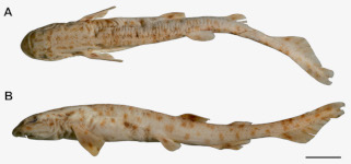 Scyliorhinus garmani (Fowler, 1934), holotype, USNM 43749, female, 267.2 mm TL ("East Indies", probably Philippines). A, dorsal view; B, lateral view. Scale bar = 20 mm. © Karla A. Soares, Laboratório de Ictiologia, Departamento de Zoologia, Instituto de Biociências, Universidade de São Paulo